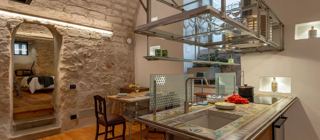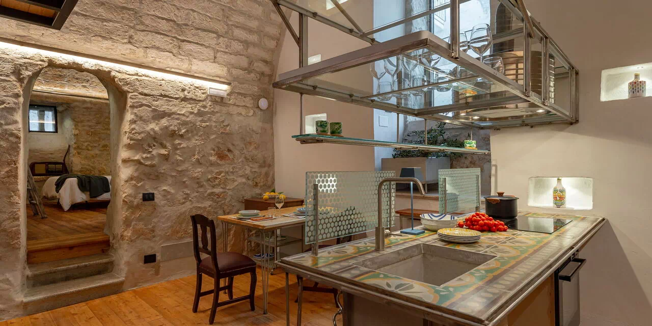 Tutti gli appartamenti hanno la cucina completa di piano ad induzione, forno, frigorifero con scomparto congelatore, tostapane, bollitore e caffettiera. I bagni sono completi dei 3 elementi e tutti hanno la doccia a filo pavimento, kit cortesia ricaricabile e phon con diffusore.