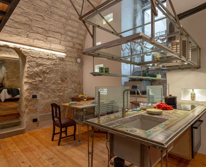 La grande dimora cinquecentesca è oggi un edificio completamente rinnovato, capace di accogliere fino a 49 ospiti in 15 alloggi, di dimensioni variabili da 36 mq a 84 mq, costituiti da zona notte e zona living con annessa cucina.
