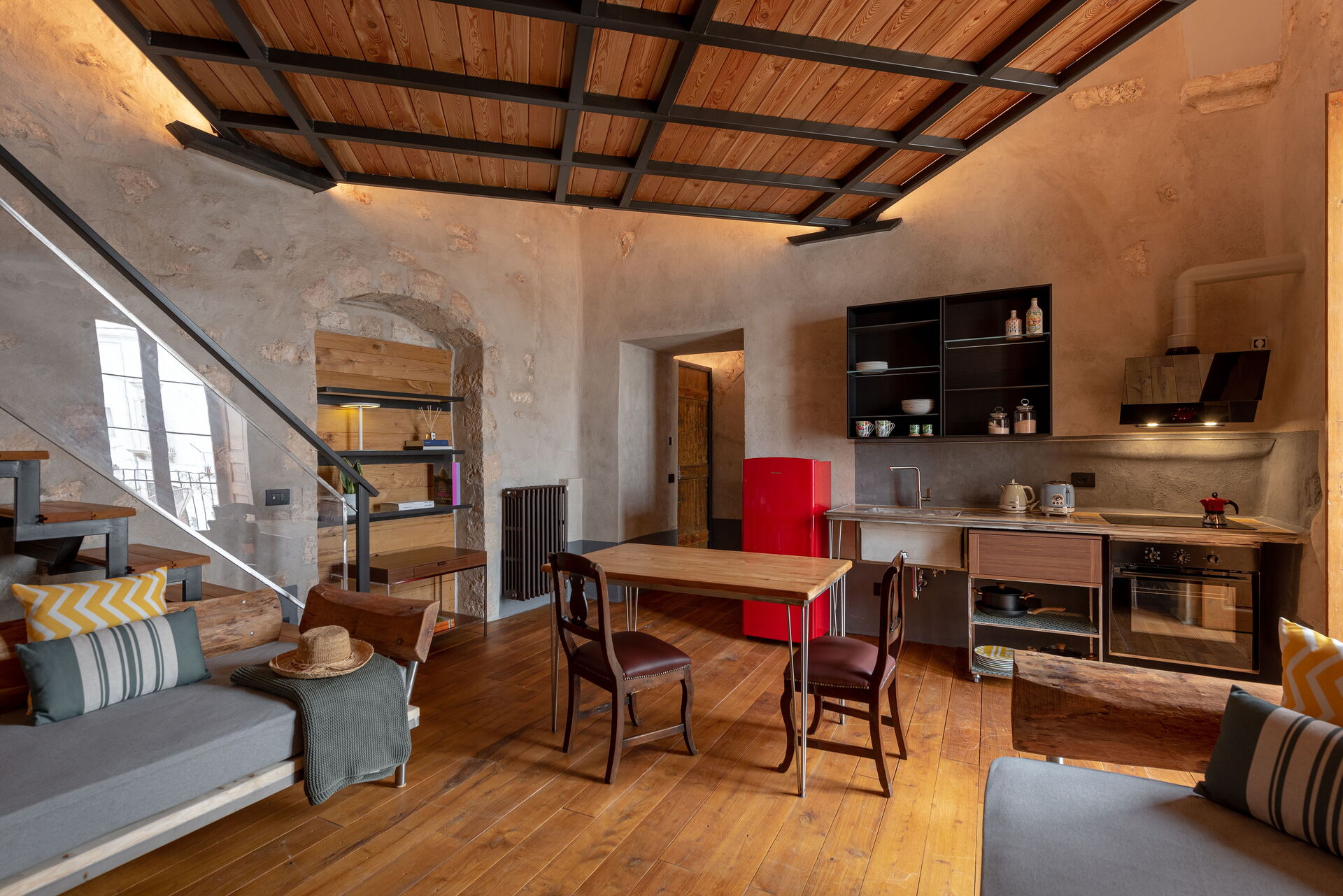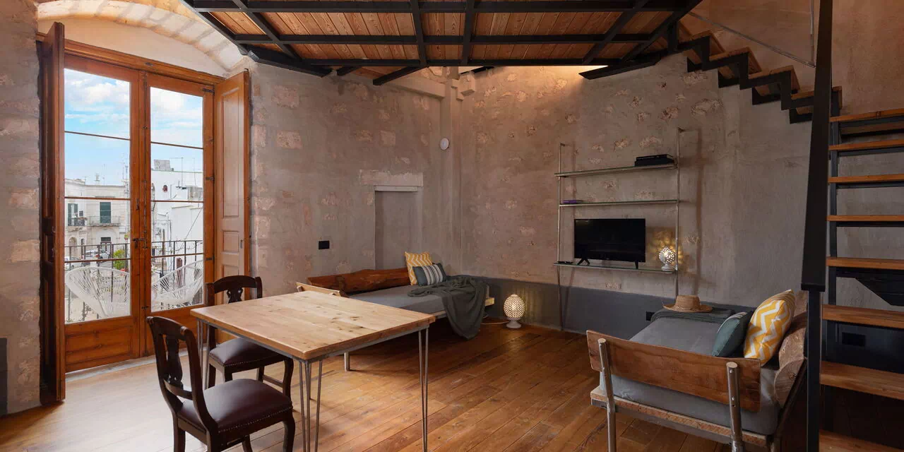 Al primo piano del palazzo con ingresso dal soggiorno comune ai 4 appartamenti, l'appartamento Acqua Cheta può accogliere sino a 4 persone accomodate tra i 2 divani letto che si trovano nella zona giorno con cucina e il letto matrimoniale sul soppalco. Completa l'appartamento l'affaccio sul balconcino privato sul fronte del palazzo.