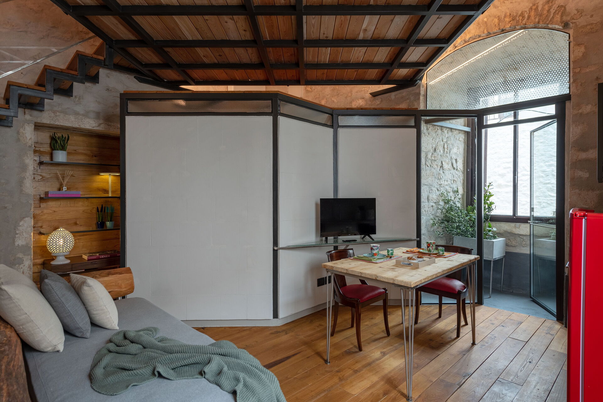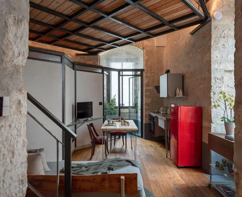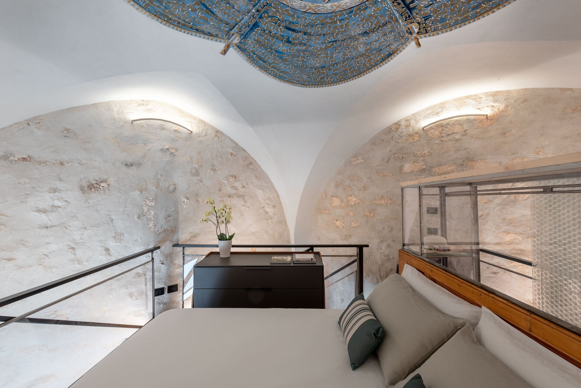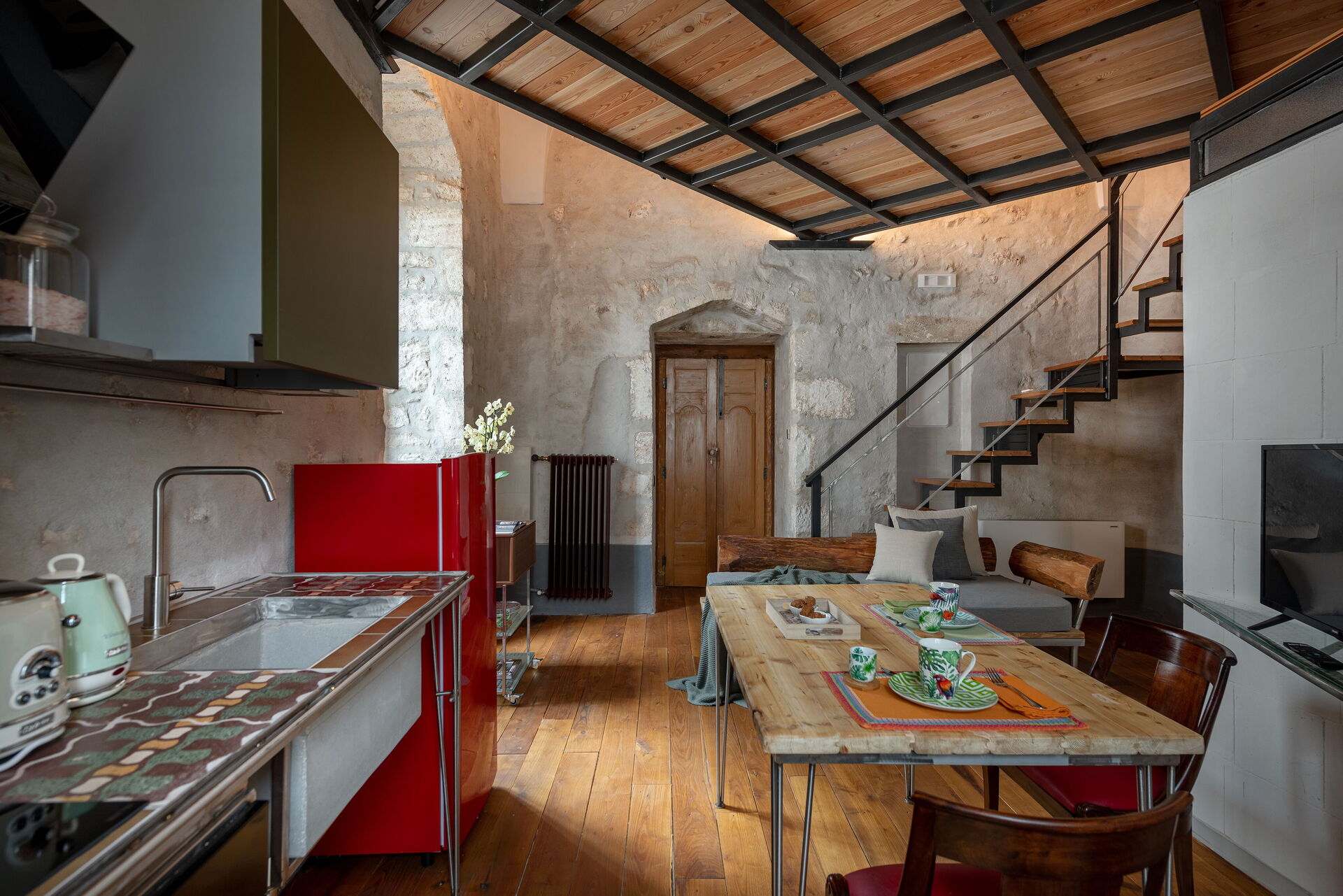 On the first floor of the building with entrance from the common living room to the 4 apartments, the apartment Oro Blu can accommodate up to 3 people seated between the single sofa bed that is located in the living area with kitchen and the double bed on the mezzanine. Its name comes from the colours of the fresco that decorates the vault and that reconciles the sleep of the guests.
