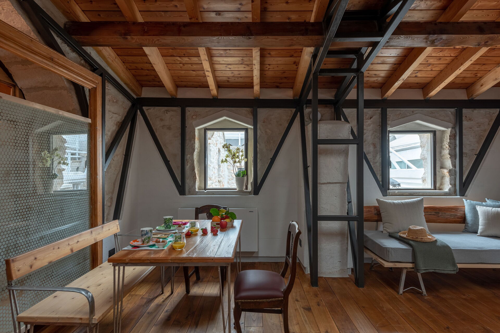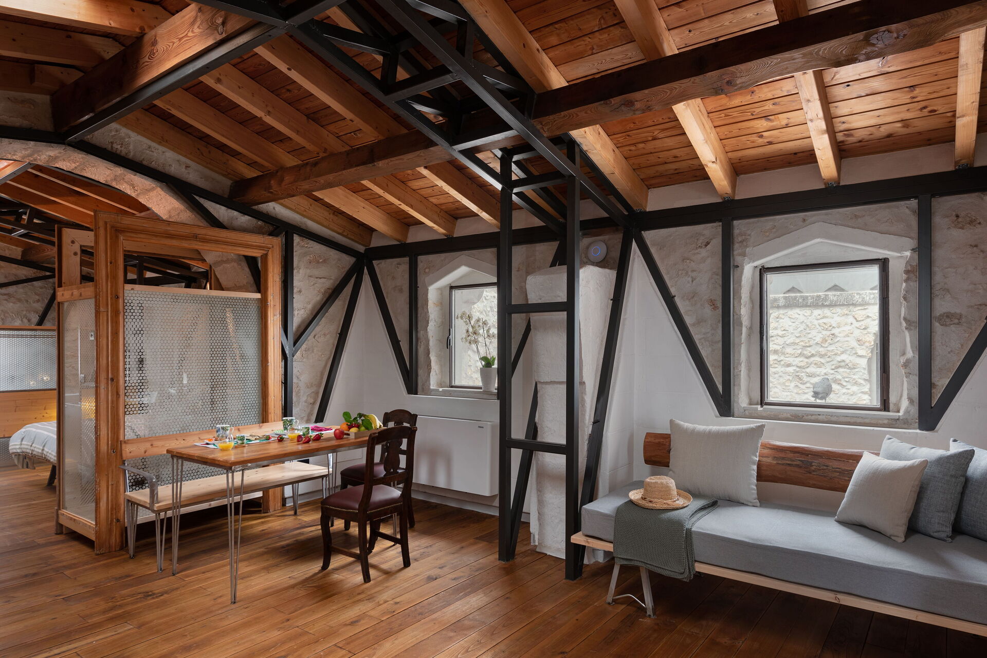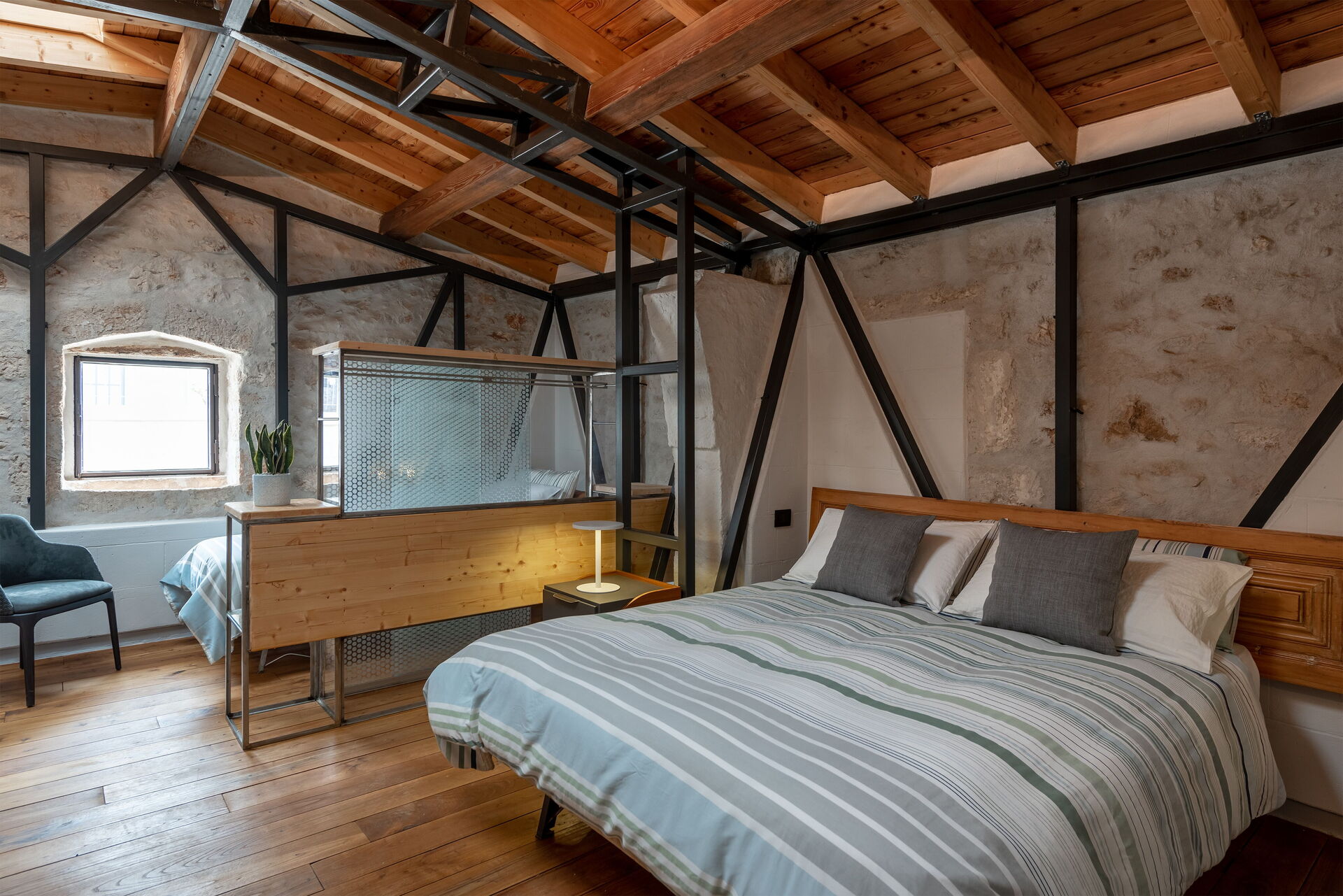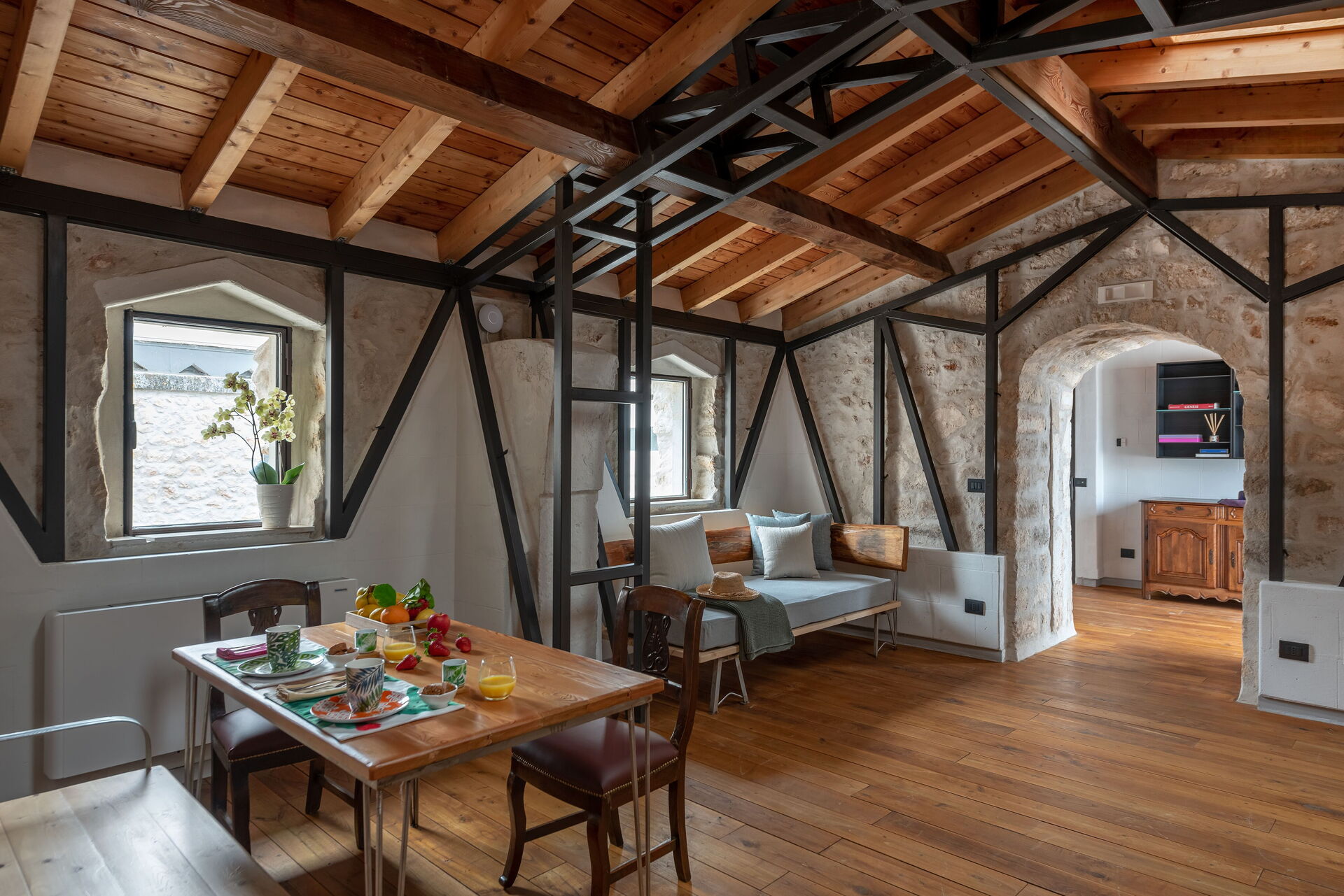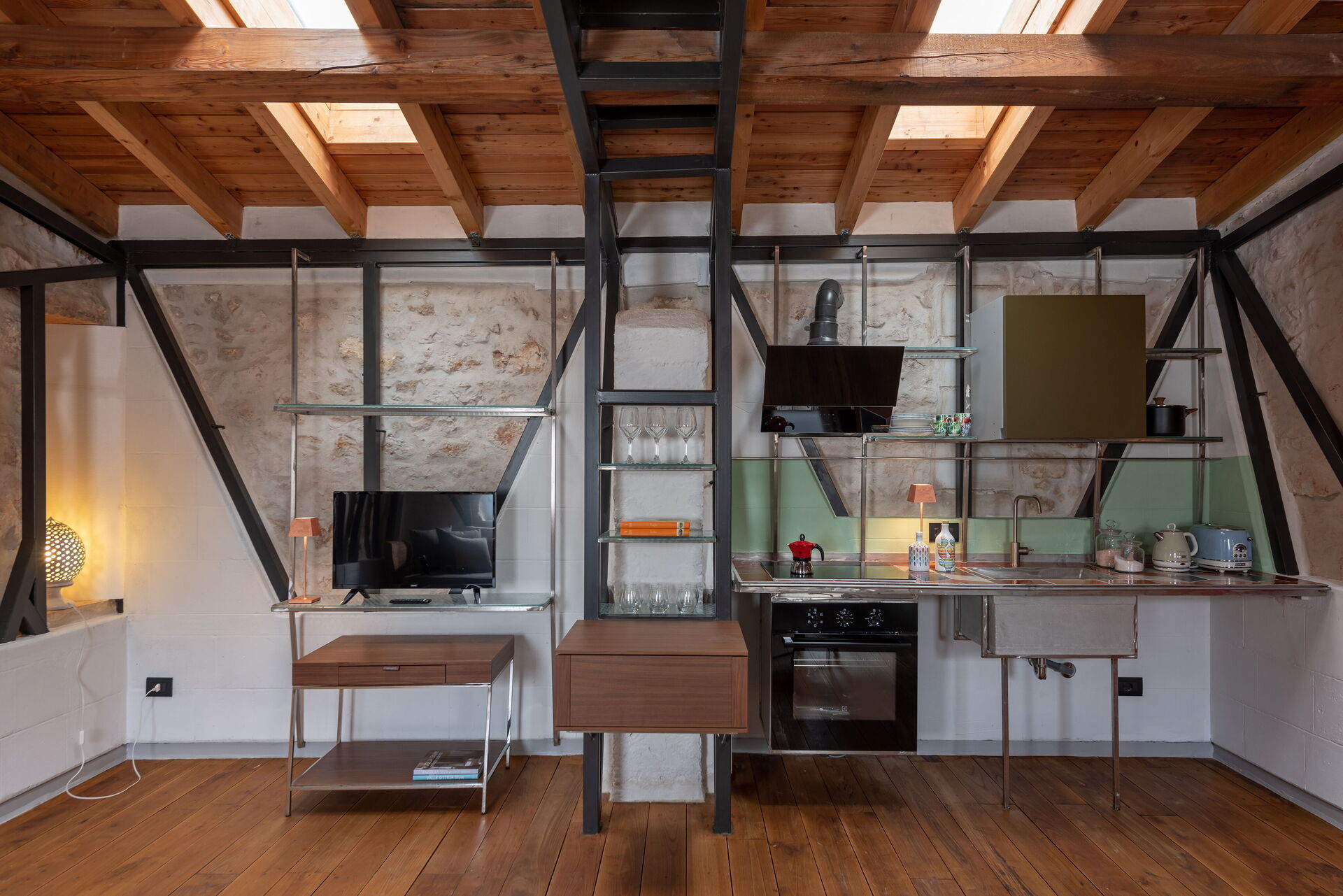 Bronzo together with Luce, Antracite and Quercia, are the only apartments that develop inside on one level. Large and bright can accommodate up to 4 people including single sofa bed, double bed and single bed. The apartment is made even brighter by the presence of skylights on the vault, so it is particularly suitable for those who love waking up with the first rays of the sun.