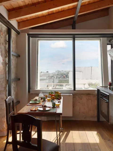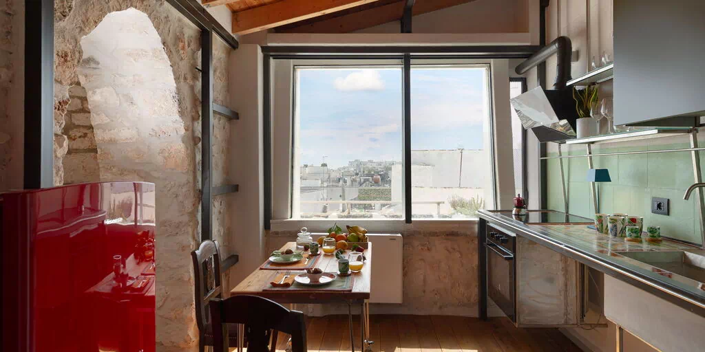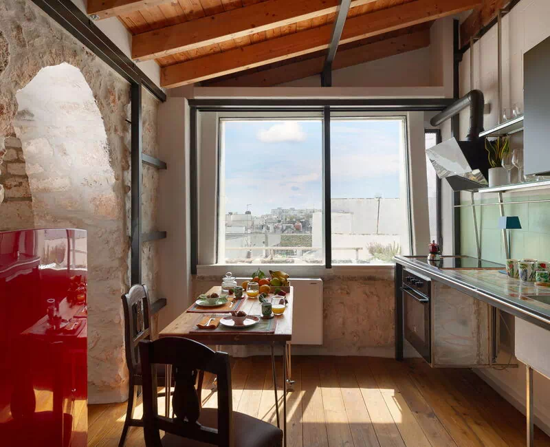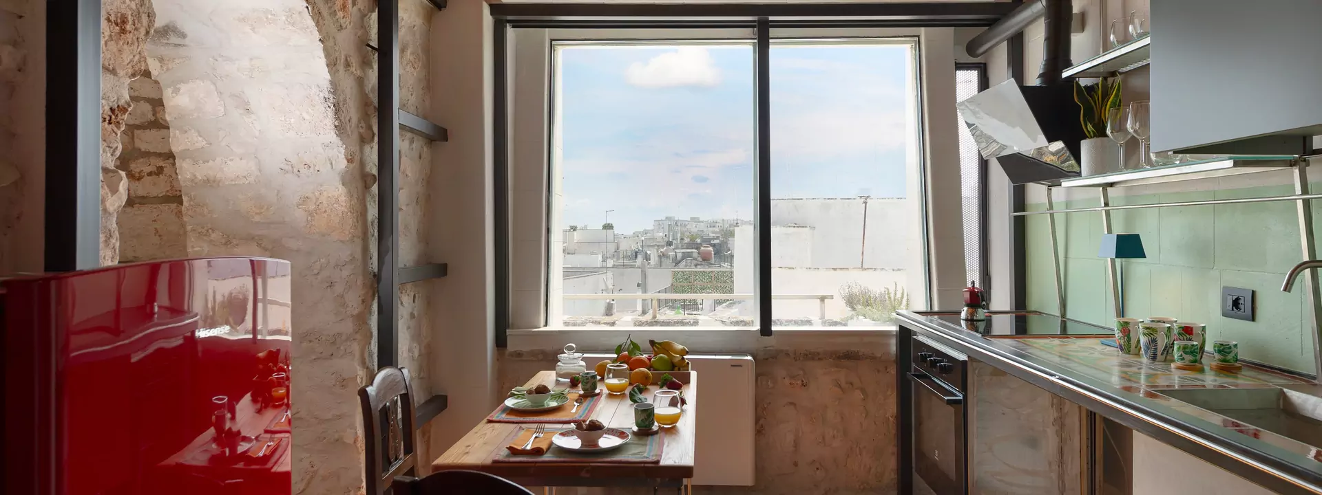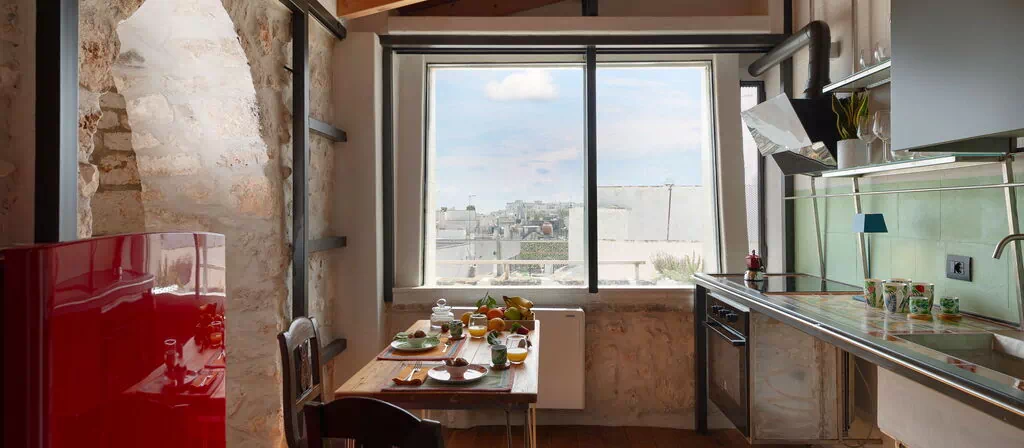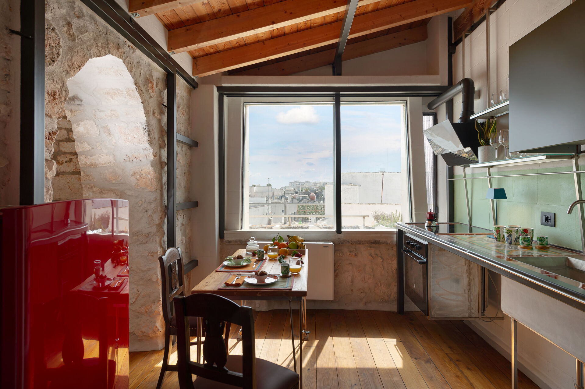 Antracite a picture of the city, his kitchen has a large window overlooking the rooftops of Ostuni. The arches follow each other inside to mark the various environments, can accommodate up to 4 people divided between sofa bed, double bed and single bed.