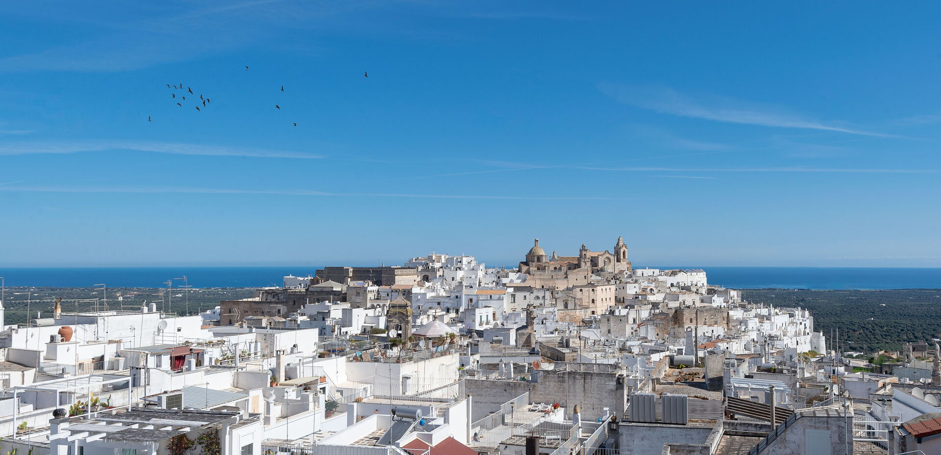 Ostuni, perched on three hills, is located inside the Itria Valley, 218 meters above sea level. It is 42 km north-west of Brindisi, 8 km from the Adriatic coast and it was awarded the Blue Flag. Ostuni, the White Town, is picturesque and to be experienced. Ostuni, a renowned tourist destination, boasts a wonderful medieval village, rich with alleys and whitewashed houses, in a maze of streets which recalls an Arab Kasbah. Take a stroll in the old town centre, called “la terra” (the land) to distinguish it from the more recent “marina”: it offers picturesque spots amid the alleys, sloping stairs, courtyards and small squares, where whitewashed houses appear, embellished with geraniums, craft shops, typical restaurants and small shops.