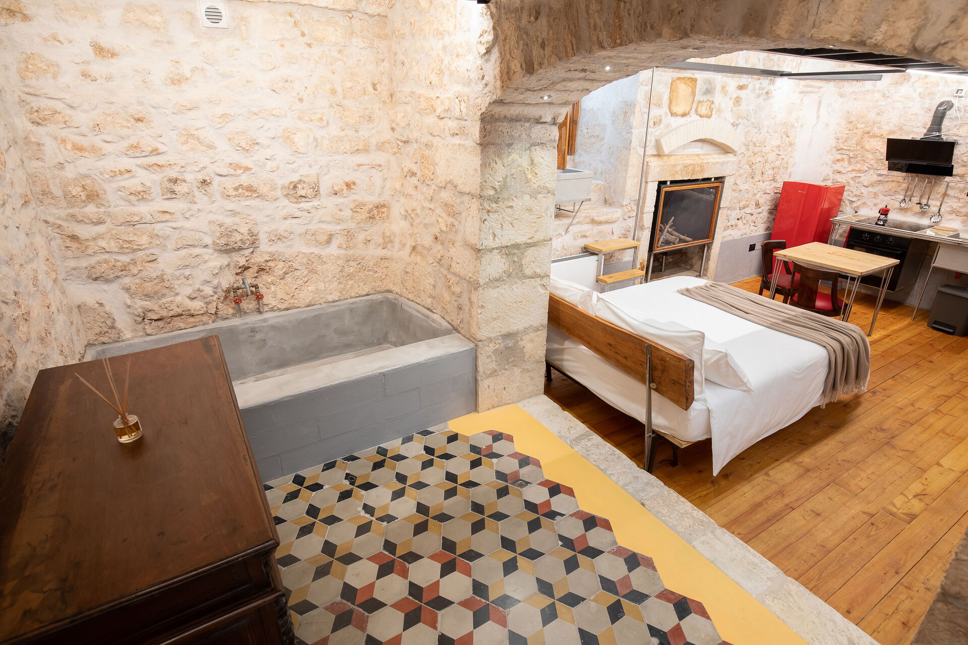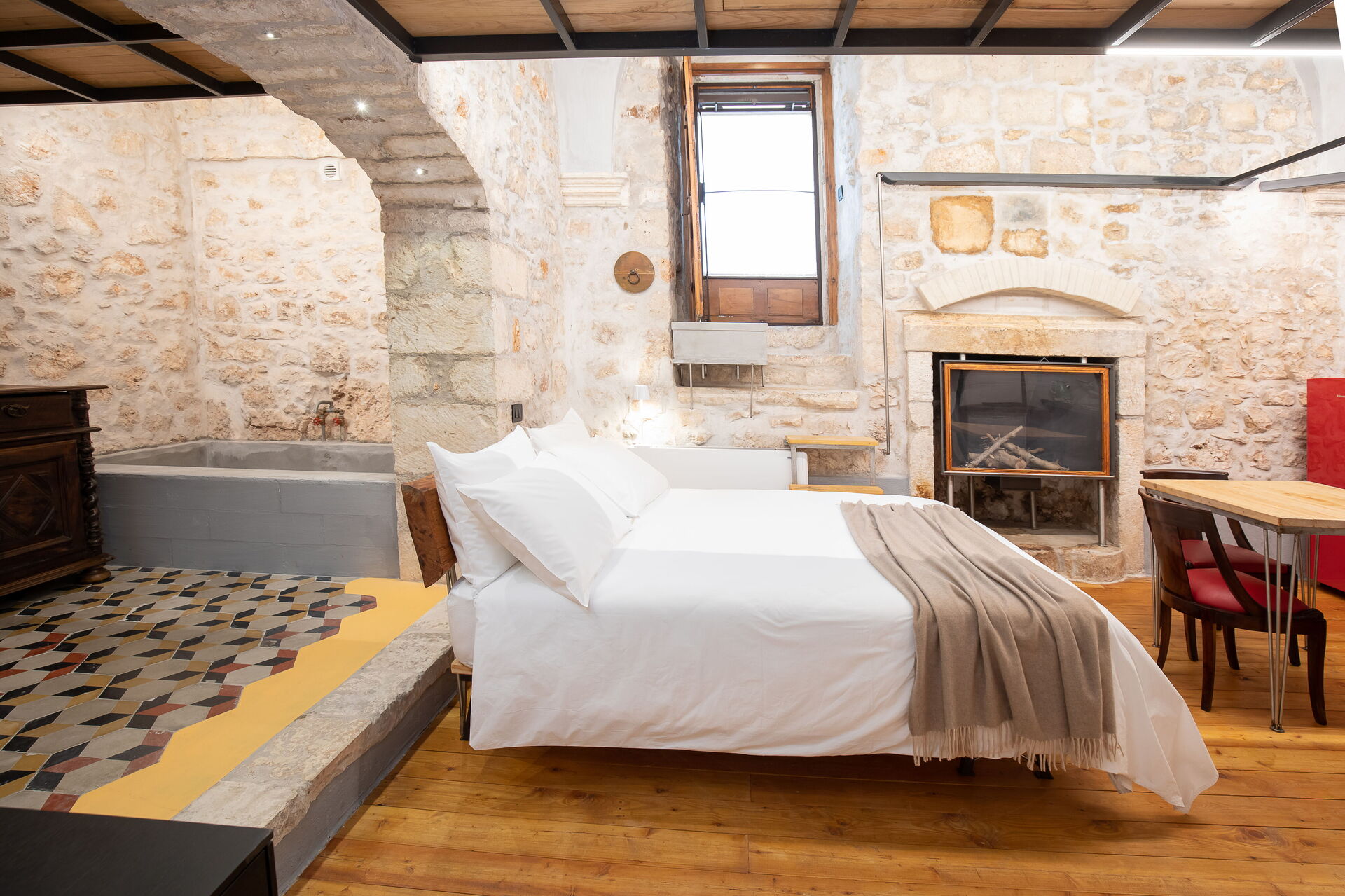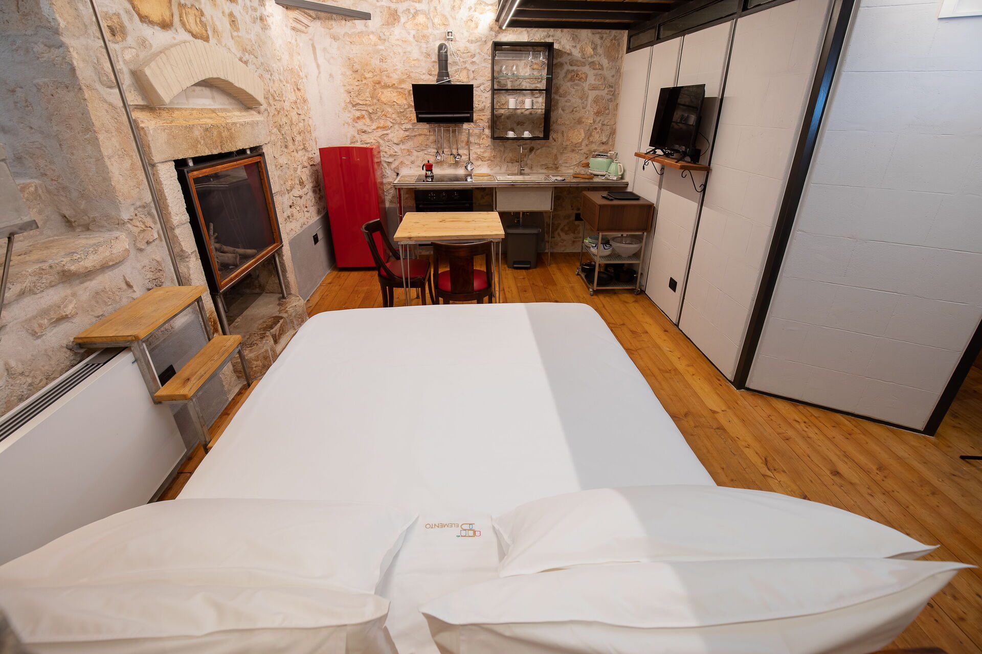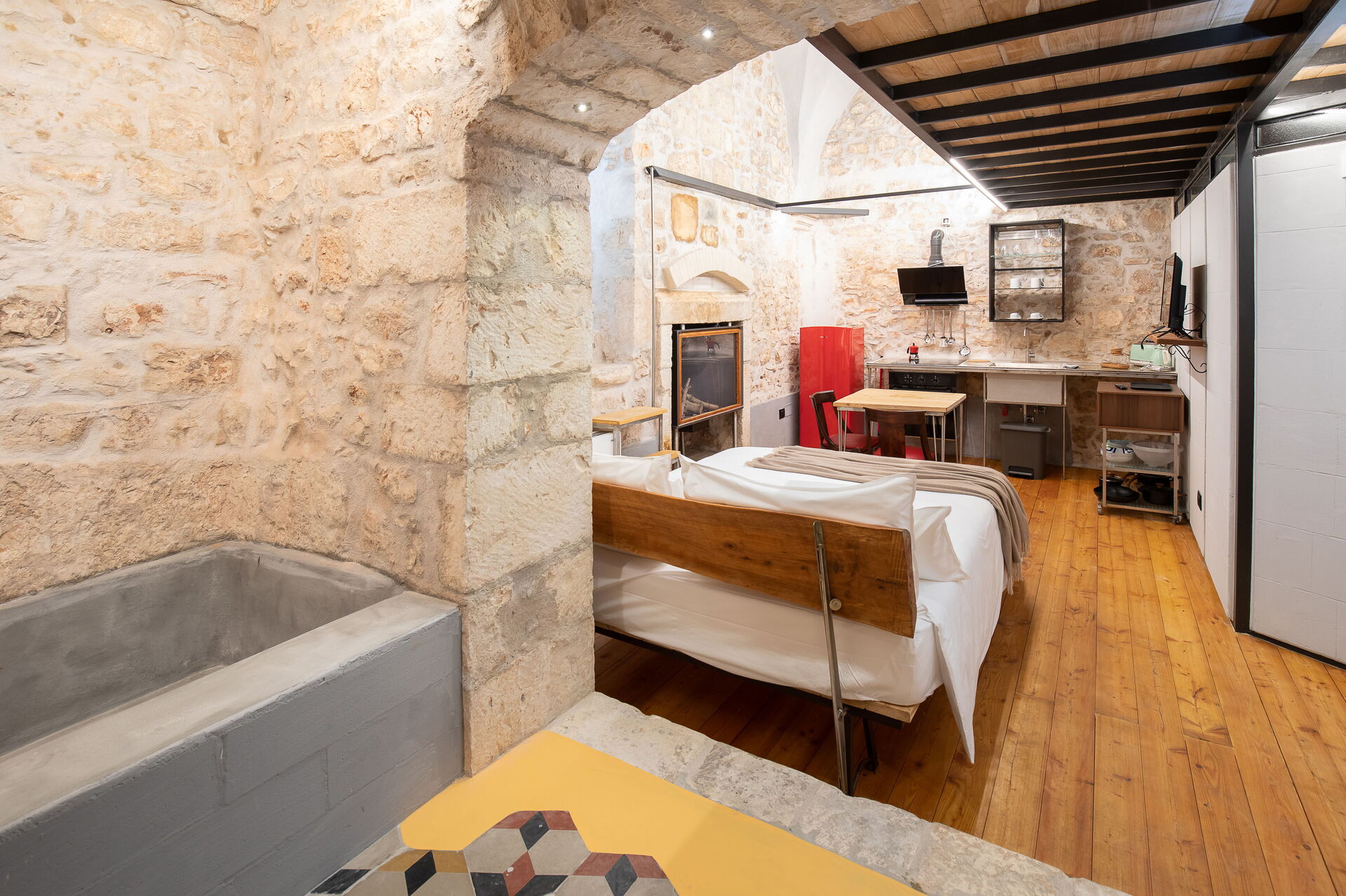 The Calce apartment is accessed from the central external courtyard, going down the entrance stairs there is a characteristic masonry bathtub for the exclusive use of the guests of this apartment. From this room you have an open view of the open space with double bed, an old fireplace visually warms the environment.