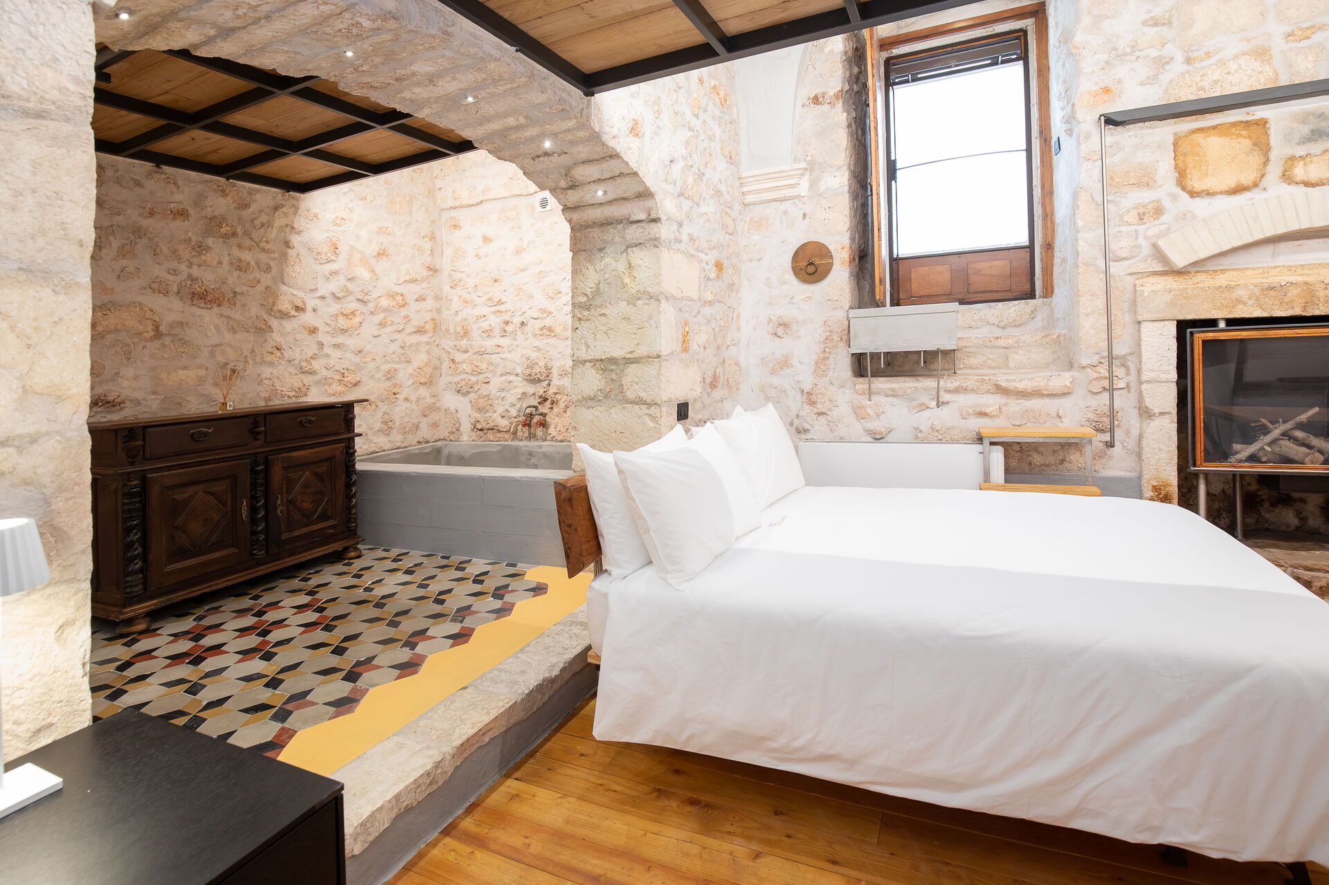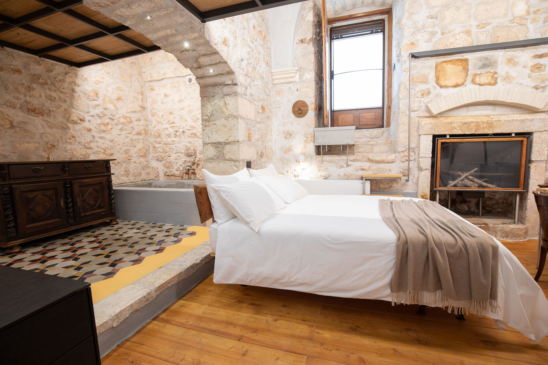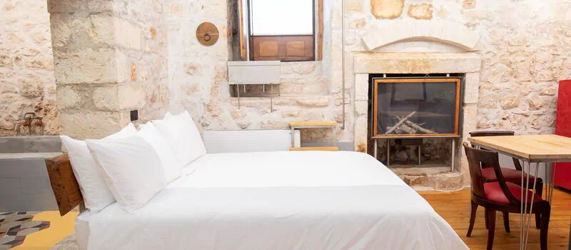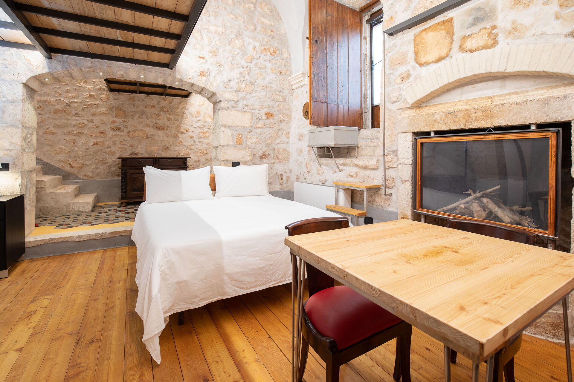 The Calce apartment is accessed from the central external courtyard, going down the entrance stairs there is a characteristic masonry bathtub for the exclusive use of the guests of this apartment. From this room you have an open view of the open space with double bed, an old fireplace visually warms the environment.