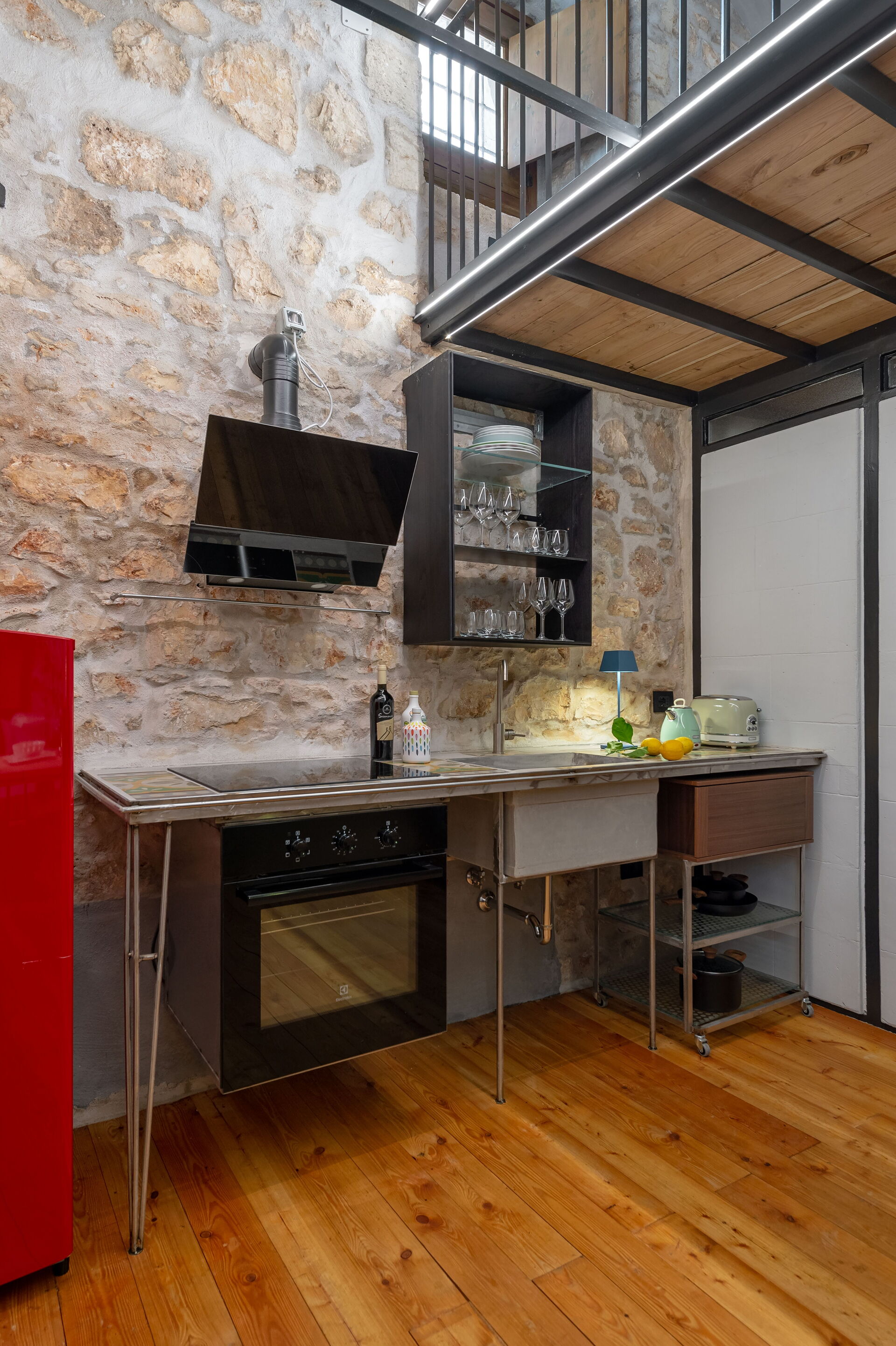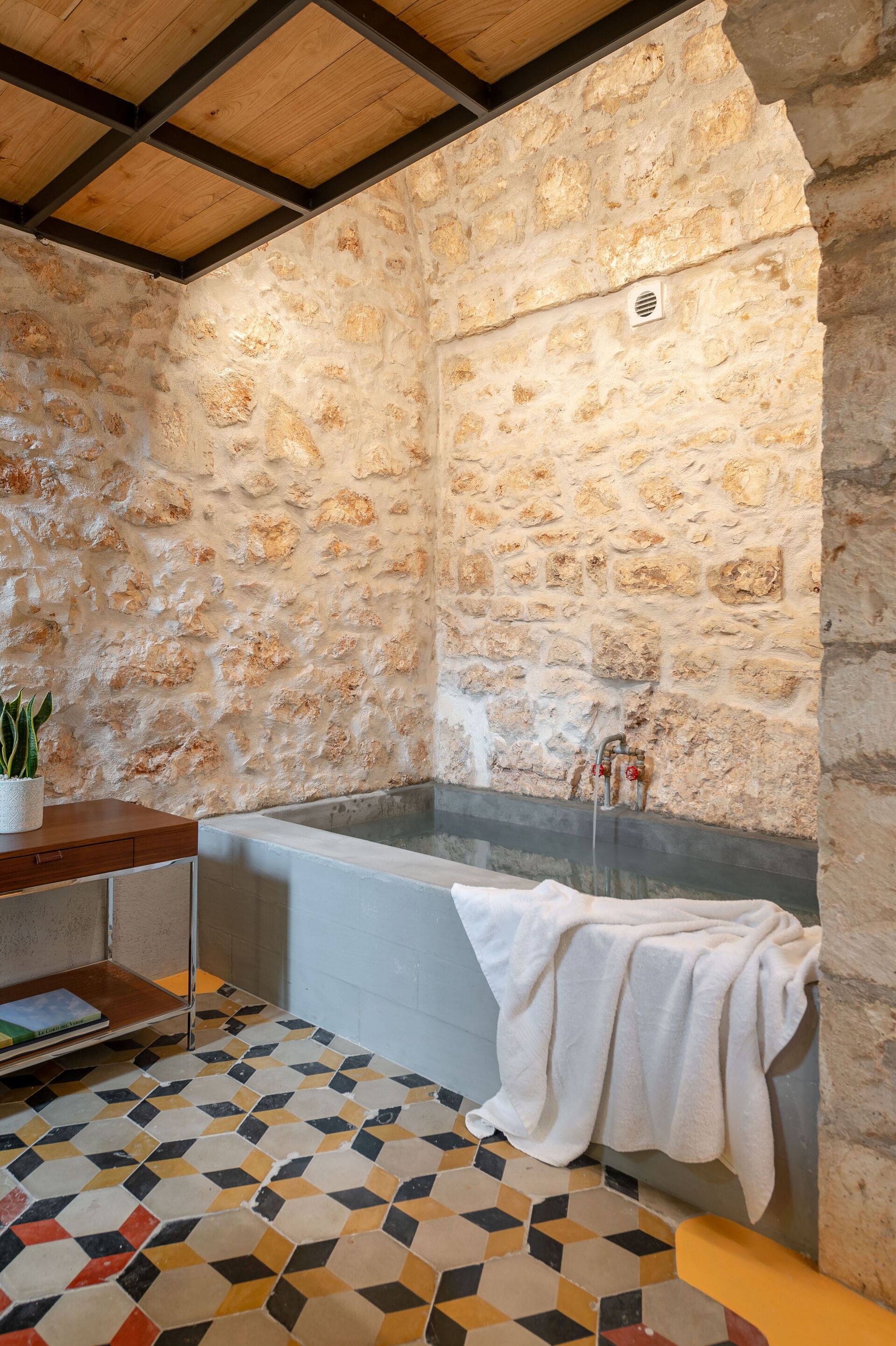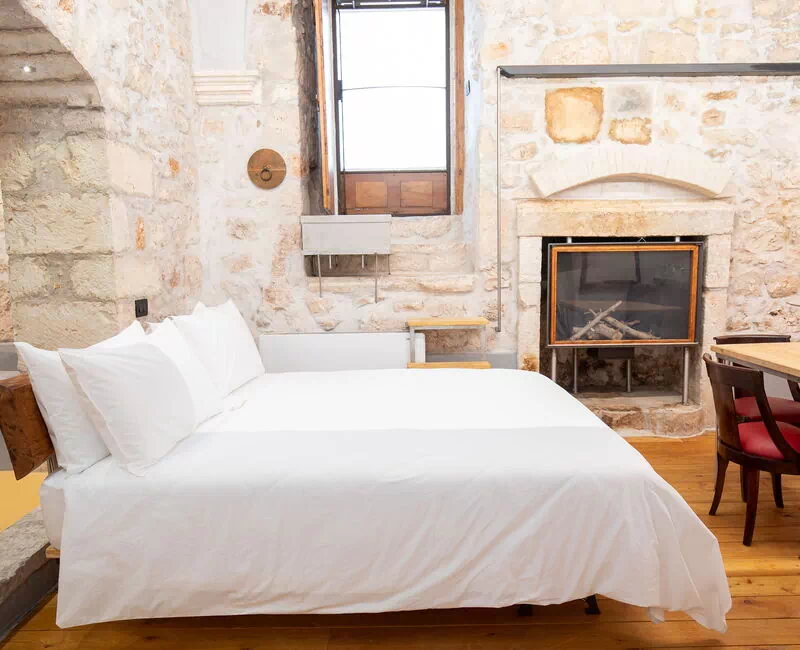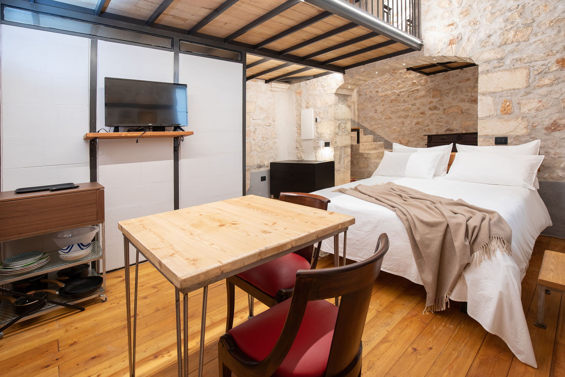 The Calce apartment is accessed from the central external courtyard, going down the entrance stairs there is a characteristic masonry bathtub for the exclusive use of the guests of this apartment. From this room you have an open view of the open space with double bed, an old fireplace visually warms the environment.