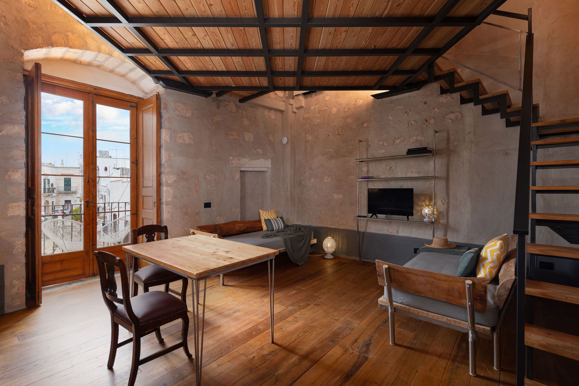 On the first floor of the building with entrance from the common living room to the 4 apartments, the apartment Fiume can accommodate up to 3 people seated between the single sofa bed that is located in the living area with kitchen and the double bed on the mezzanine. Complete the apartment the private balcony overlooking the square in front of the building.