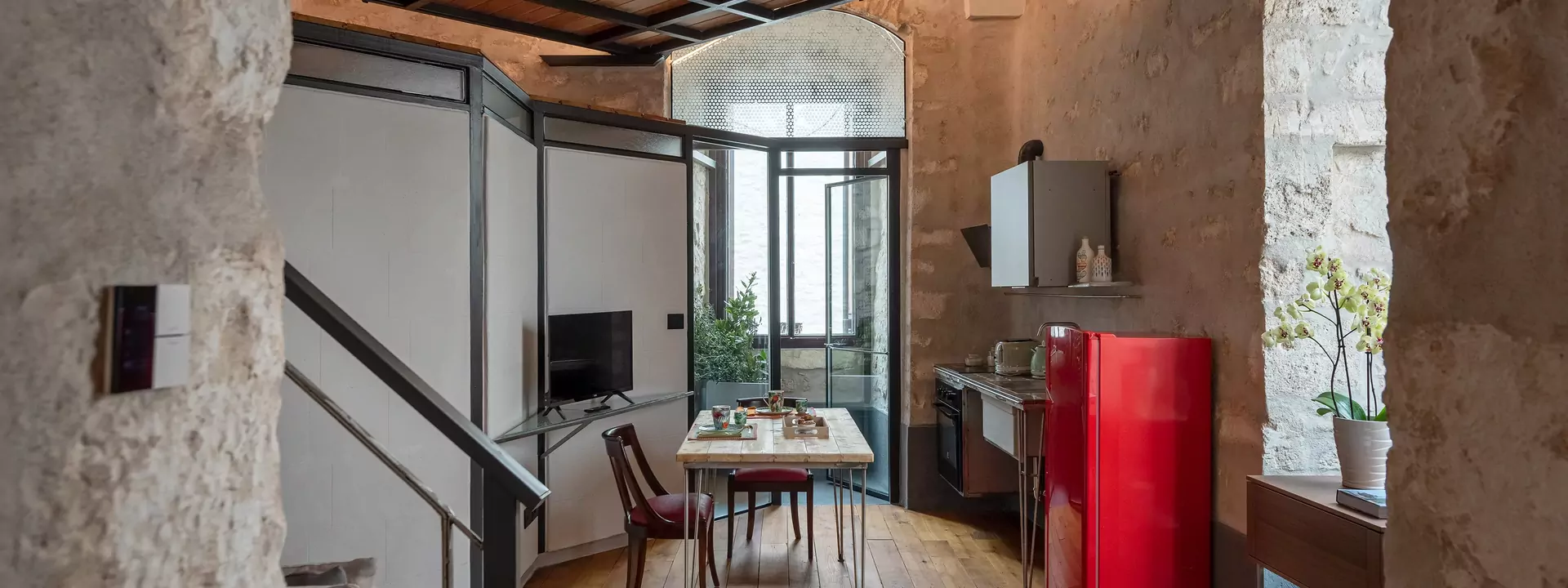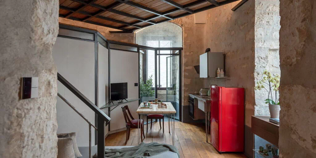 On the first floor of the building with entrance from the common living room to the 4 apartments, the apartment Goccia can accommodate up to 3 people seated between the single sofa bed that is located in the living area with kitchen and the double bed on the loft.